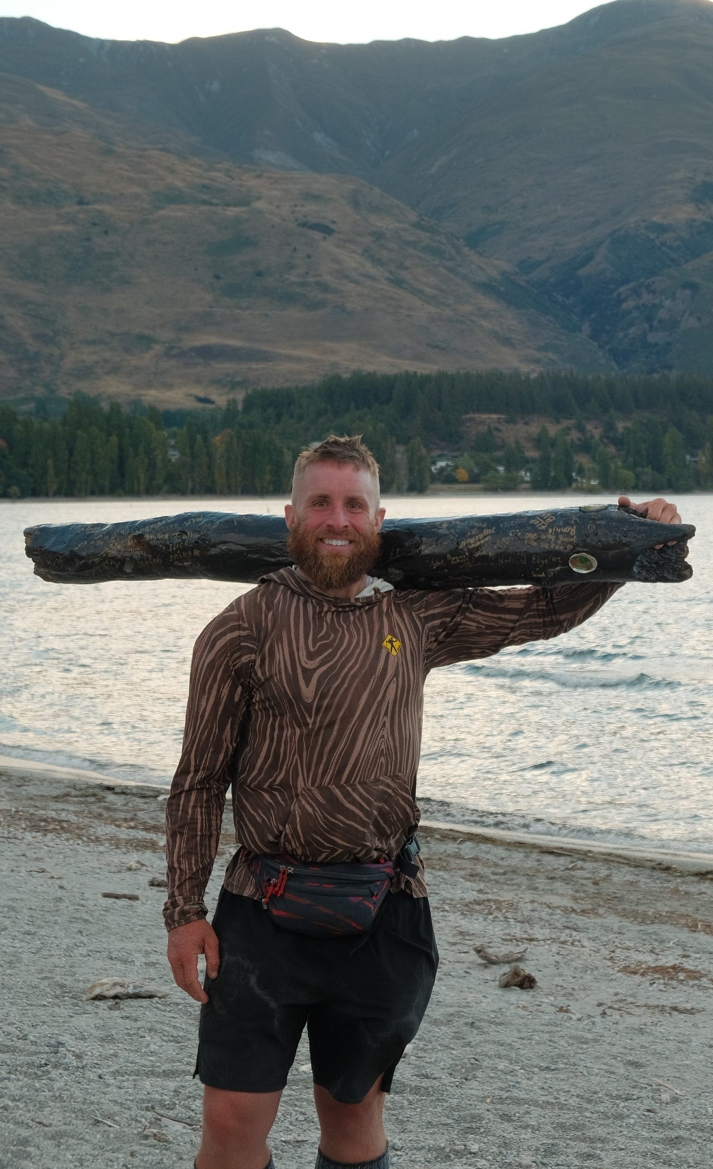 The log used for this trek is fossilised in discipline, with cracks drawn tight like the thin lips of a sergeant. It is sourced from a 2,500-year-old kauri tree and was gifted to Shawn by a Trail Angel at the northernmost point of the trail. Carved in the shape of a tuna, cream pāua shells mark its eyes and pounamu stones trace its jagged jaws as emerald teeth.