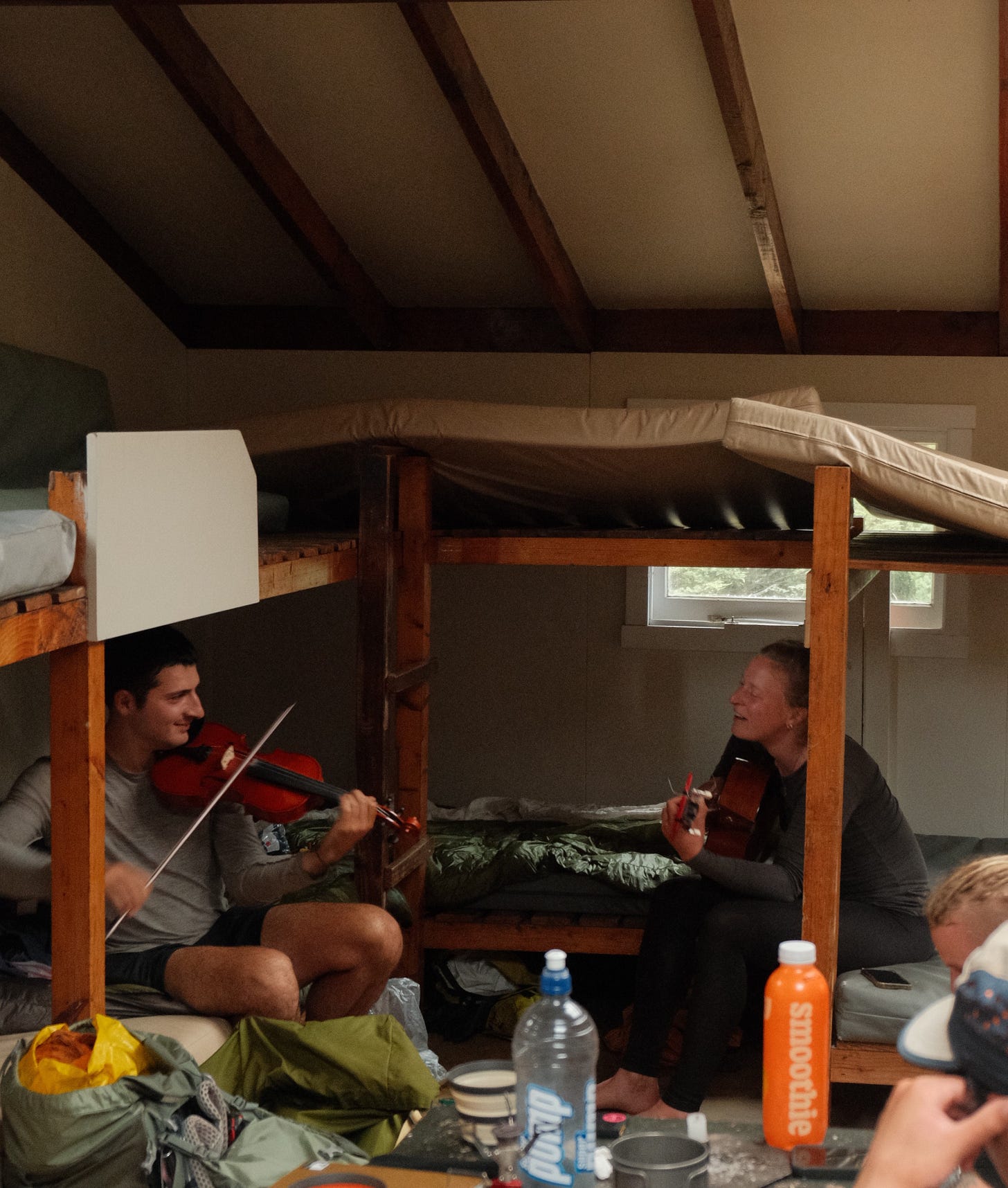 Jean-Baptiste, a professional musician and violinist since the age of six, has brought his stringed beauty 2,050 kilometres down Aotearoa. He has performed in theatres and concert halls, on rivers and ridgelines, and now he has duetted in a shabby wooden hut next to a portal to another world.